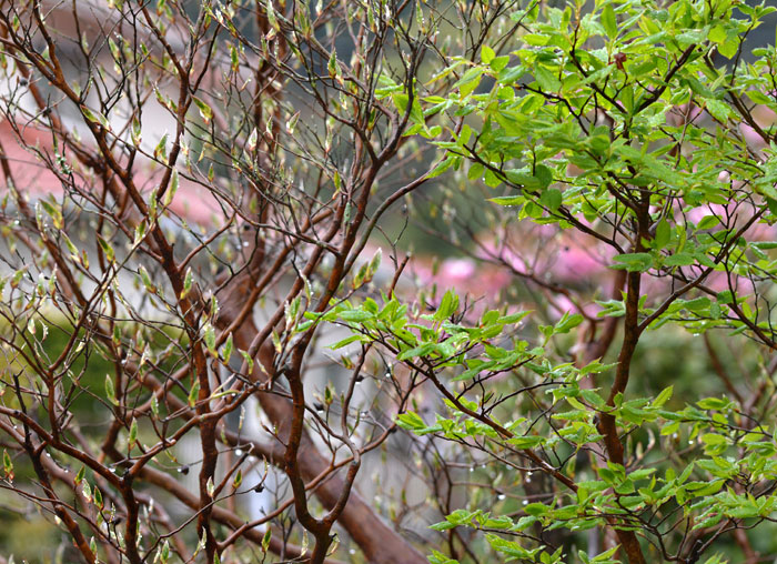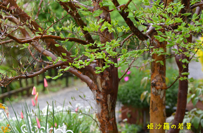 この姫沙羅は根元の方で二つに分かれているのですが、成長のスピードが違うようで、若葉の様子も全く違います。