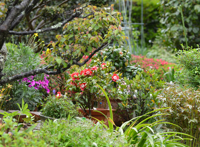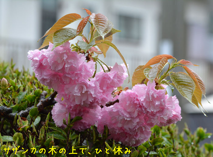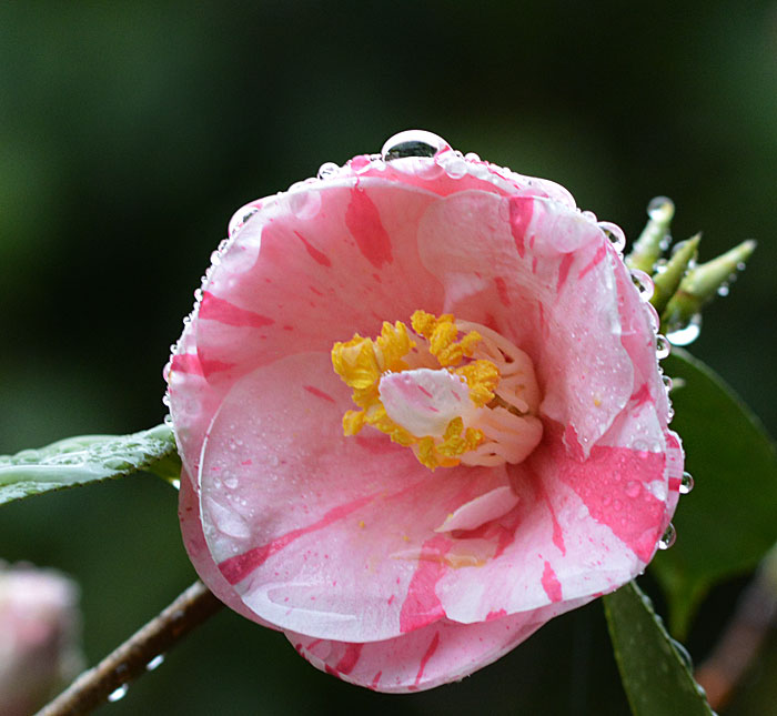 絞りの椿もびしょびしょ。あら、おしべの一部が花びら型です。