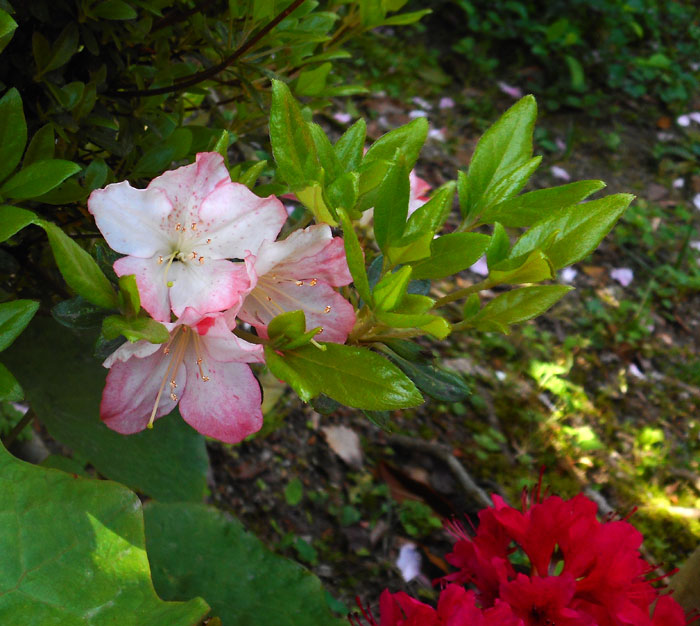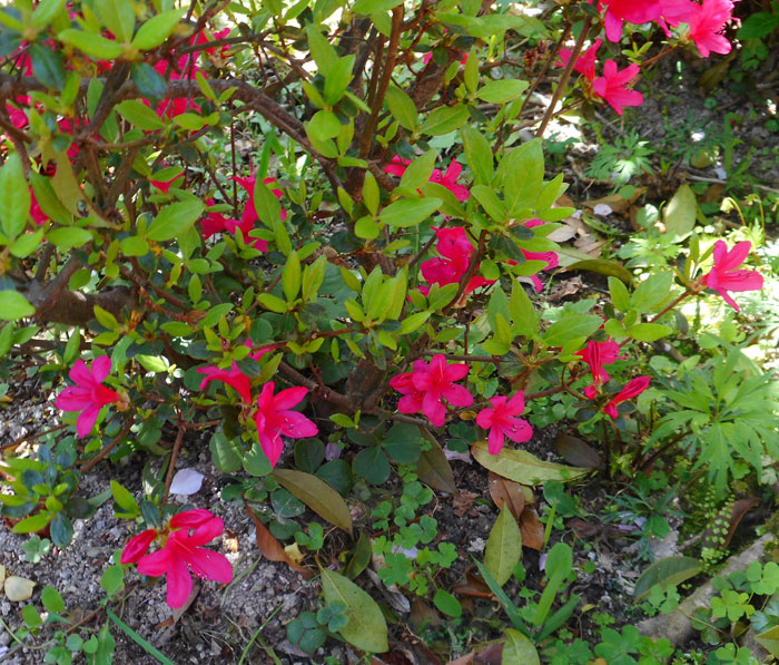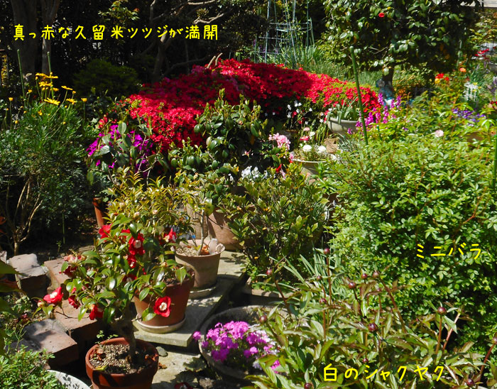 庭の真ん中あたりの真っ赤なツツジは、きれいに咲いています。