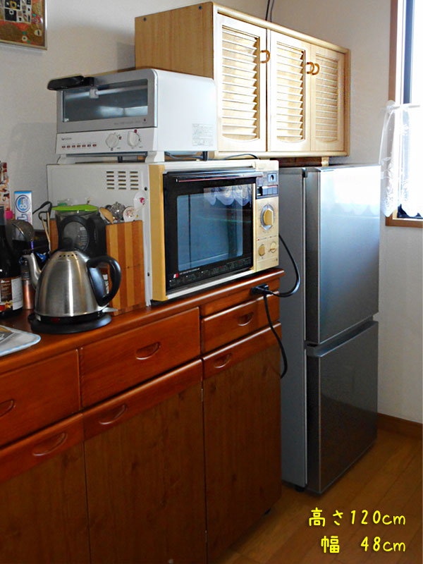 冷蔵庫の上とオーブンレンジの上に載せた扉付きラックは、以前から子供部屋にあったもので、最近は大した物を入れていなかったの。もったいないので、食器類やお茶、コーヒー豆などのストックを入れるのに使うことにしました。