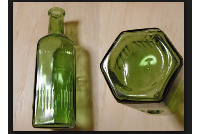 瓶のまわりに立体的な流れ出るような筋があるのがわかりますか? これは、昔、危険な液体が入っている瓶には、文盲の人でもわかるように、隆起した筋をつけたことの名残だそうです。