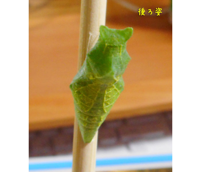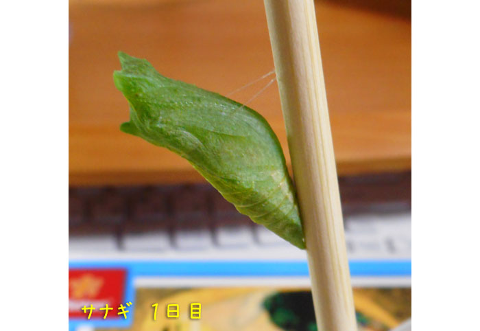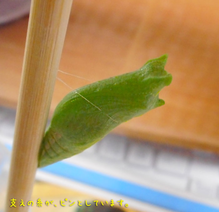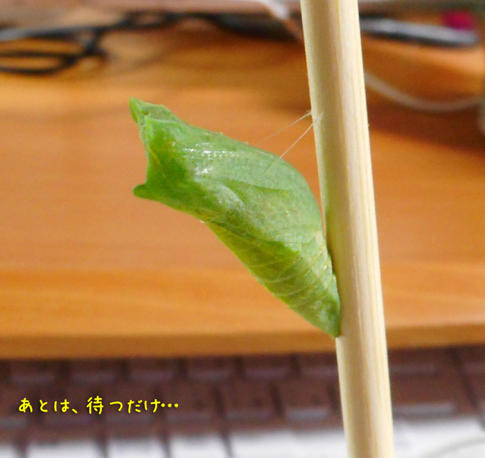これからだんだん色が変わっていって、中の翅(はね)が透けて見えるようになってきたら、羽化が近い・・・ということなんだけどな。