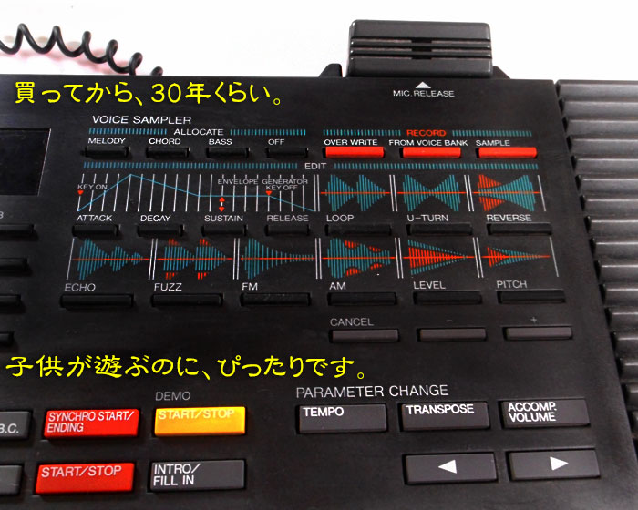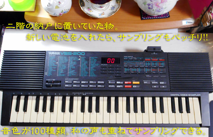 で、ふと思い出して、二階の納戸を見てみたら、これがありました。これはヤマハのサンプリングキーボード。電池を入れて、スイッチを入れてみたら、大丈夫。壊れていません。私の声を試しに入れてみたら、ちゃんと使えます。
