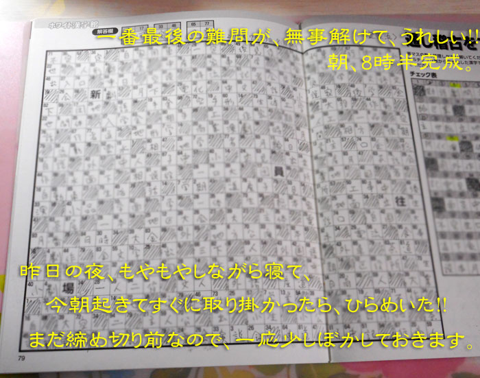 最後に、ご報告。昨日のせていた、漢字パズル雑誌の最後の難問が、今朝解けました。