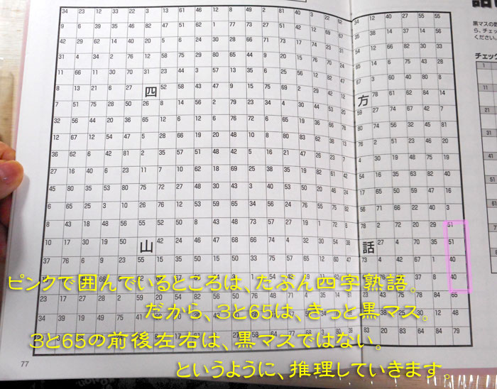 この問題では、「51,51,40,40」という四字熟語がヒントになります。その上下は必ず黒マスになりますから、「3」と「65」は黒マス。他の場所の「3」と「65」も黒ます。そして、その上下左右は全部黒マスではないので、チェック表に黒マスではない印をつけておきます。