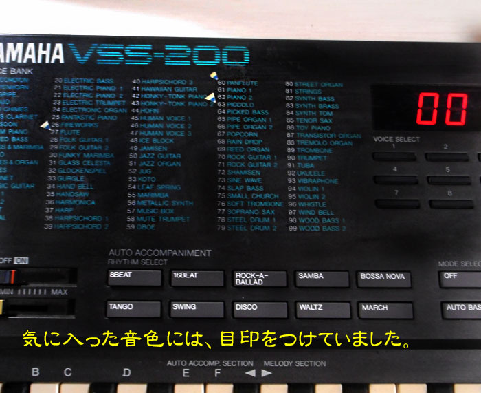 好きな音色は、小さな英語で書いてあるので見にくい。それで、△に切ったシールを貼っていました。