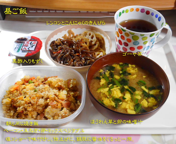 昨夜、旦那が飲み会だったので、手抜きで焼きめしにしていたので、それが今日のお弁当。買い置きの刺身こんにゃくとちくわ、納豆を添えて頂きました。