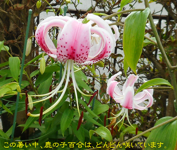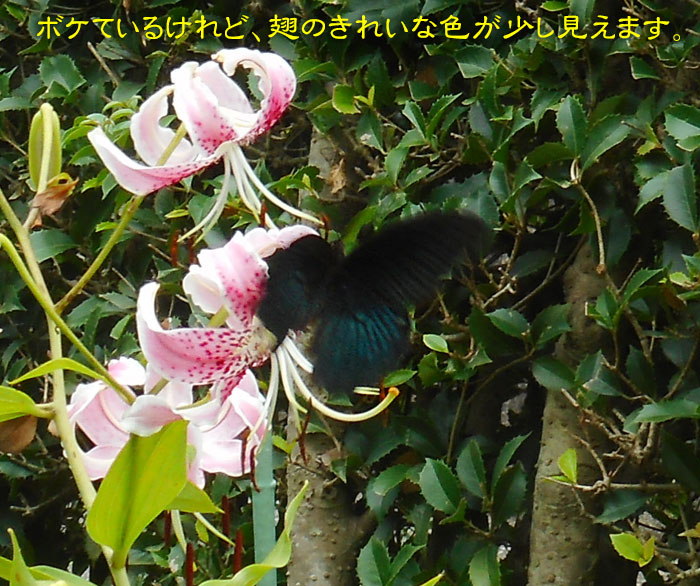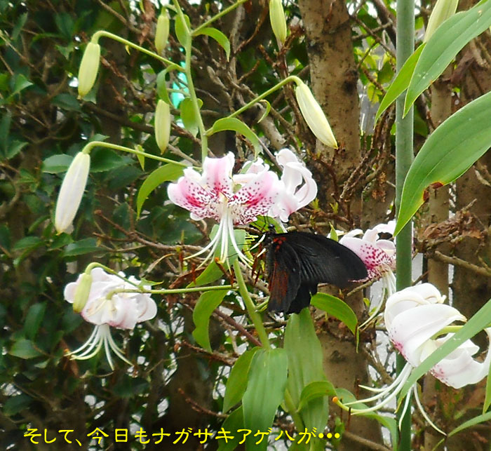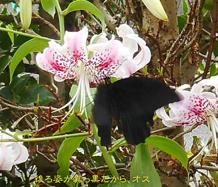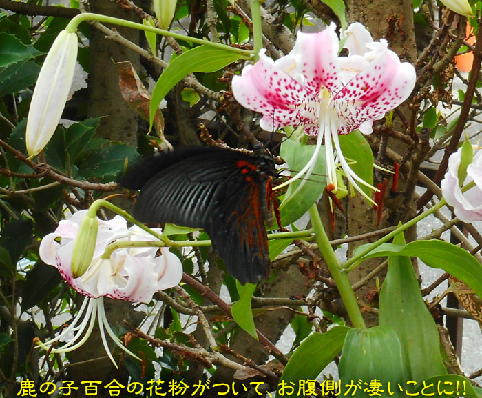 もともと、ナガサキアゲハには、お腹側にオレンジ色の模様があるのですが、カノコユリの花粉がべっとりついて、すごいことになっていましたよ。 背中は無事のようです。