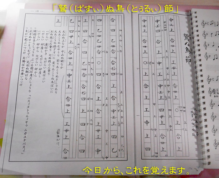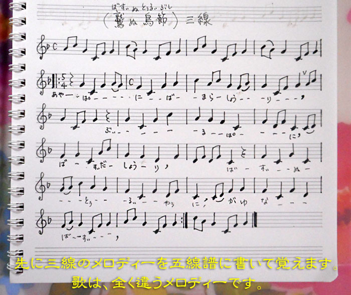 ただ聞いているだけでは、なかなか正確に覚えられないので、これまた何度も先生の歌を聞いて採譜して五線譜に表して覚える予定です。