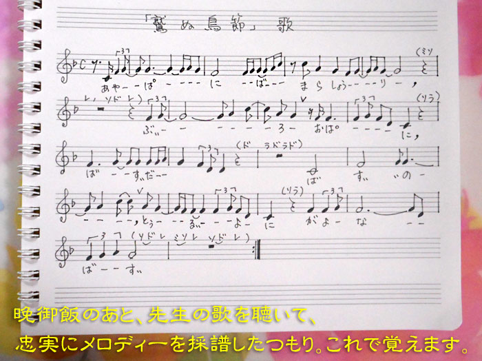 晩御飯のあとで、先生の歌(CDでもらっていた)を何度も何度も聴いて、忠実に採譜しました。