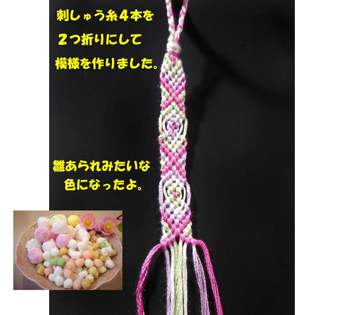 それで、ピンクと紫と黄緑色の刺しゅう糸は、他のよりも20cmくらい長くして作りました。