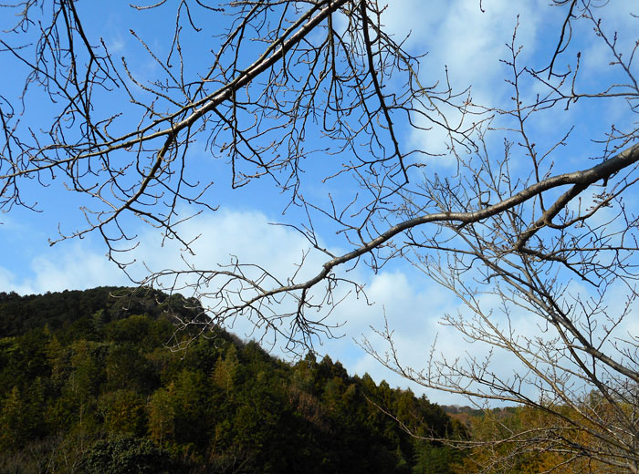 上を見上げると、小さな芽がついた桜の木の隙間から、きれいな青空が・・・