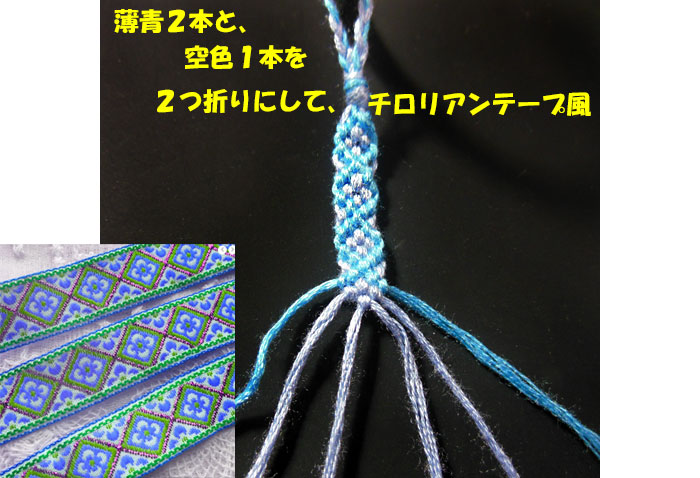 この場合、空色がたくさん見えていますよね。つまり、たくさん出したい色の糸は、少し長くしておかないといけないのですが、この時、それを忘れていたので、短いものができあがっています。