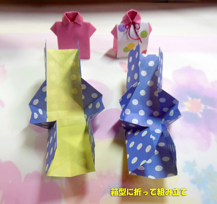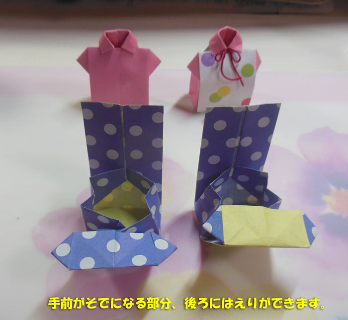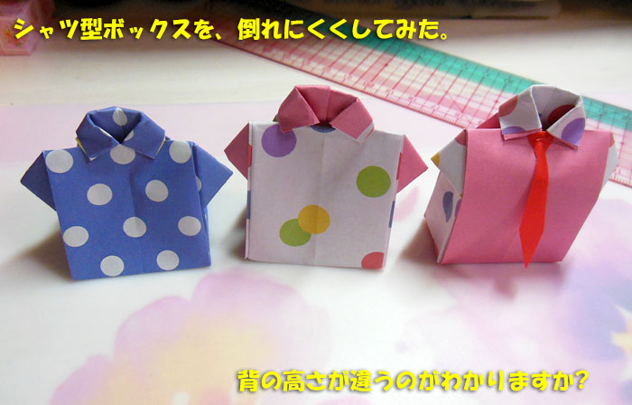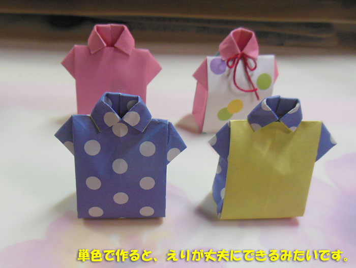 倒れにくくするには、中身を入れておくこと。えりを丈夫にするには、ひらひらしないように固めておくこと。ただ、単色で折るなら、そのままで丈夫。