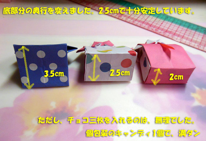ただ、チョコ三個を入れるとまあまあ倒れにくいので、形を変えるのは、やめました。