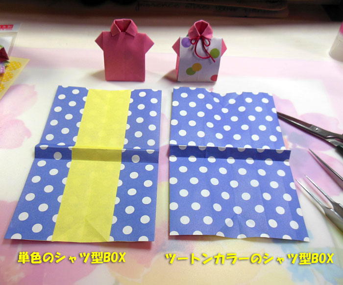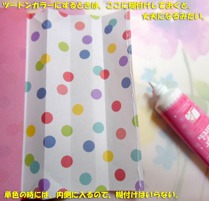 ツートンカラーの折り方だと、えりがひらひらになってしまうので、のりでくっつけてみました。