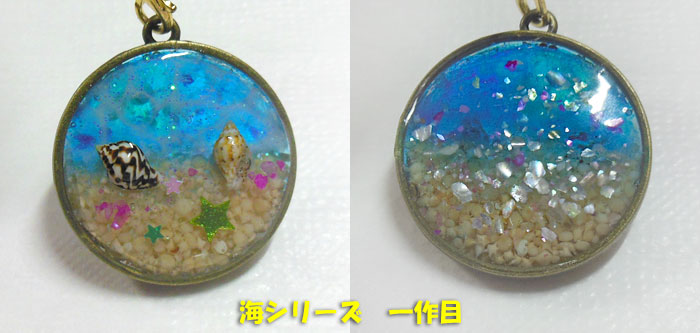 左側のが、海シリーズ。小さな巻貝を二個と、ヒトデにみたてた星を何個か入れています。
