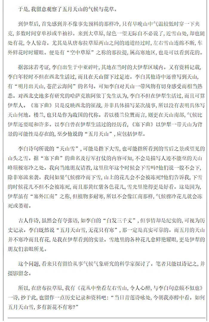 後半で、実際に見た天山には、雪があるけれど、花がないことはない、でも、李白が書いているのだから、五月に花が無い、なんてことがあるのか、気候気象学の科学者の研究にゆだねたい、ということが書かれていました。