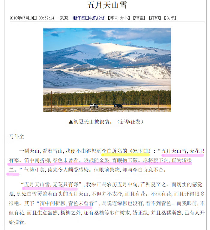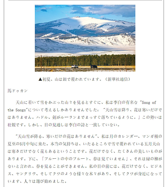 ようするに、この方が言いたいのは、「五月、天山には雪があるけれど、寒いだけではなくて、花が咲き、樹木の緑も美しく、桑の実が熟して人々がそれを摘んで食べたりする」ということ。