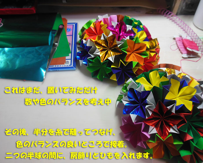 半球ずつ作って、貼り合わせる時に、真ん中に長い房飾りを挟み込む、というもの。