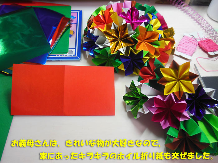それで、 年を取ってもきれいな物が大好きなお義母さん に、お見舞い用のくす玉を作りました。
