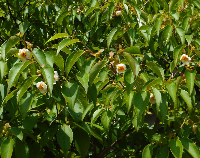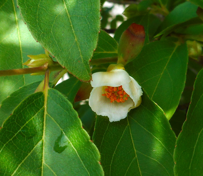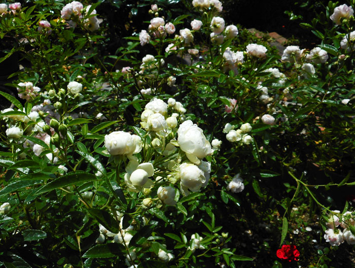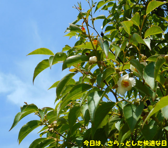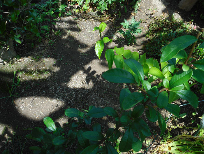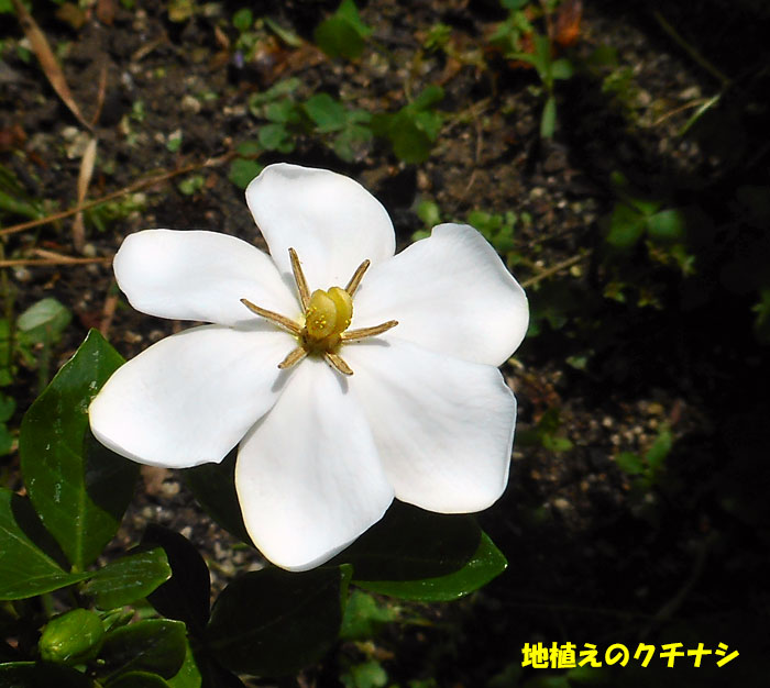 鉢植えの方のクチナシは、そろそろ黄色くなって、終わりの雰囲気ですが、こちらの地植えにしたクチナシは、八重桜で少し日陰になっているからでしょうか、ようやく一つ咲いたところ。
