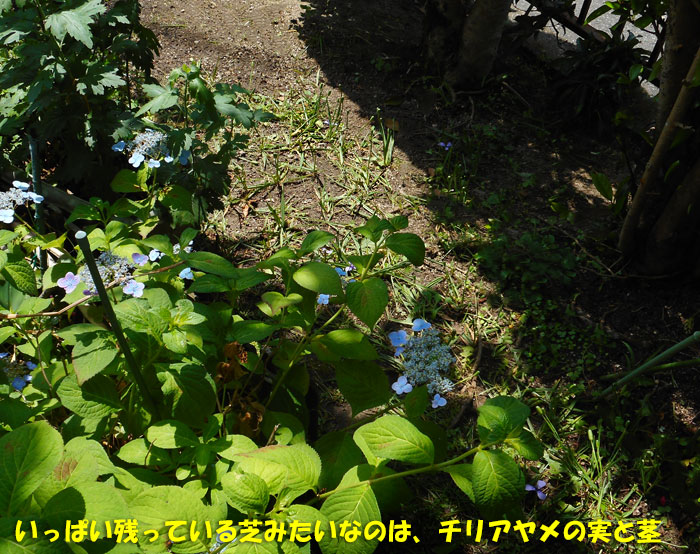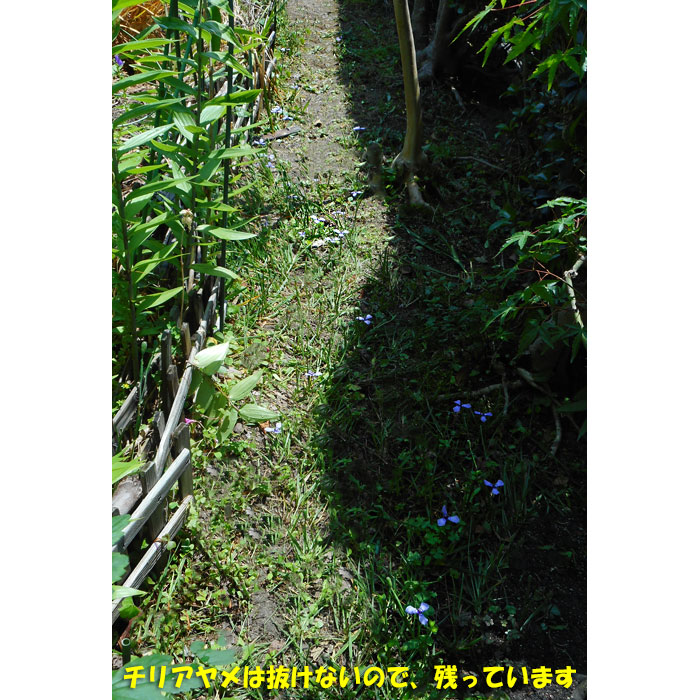チリアヤメの茎はなかなかちぎれないし、根こそぎ引っこ抜くのも至難の業。庭師さんたちも、このチリアヤメのことはご存知のようで、草取りの対象になっていませんでした。