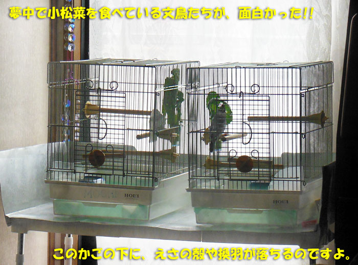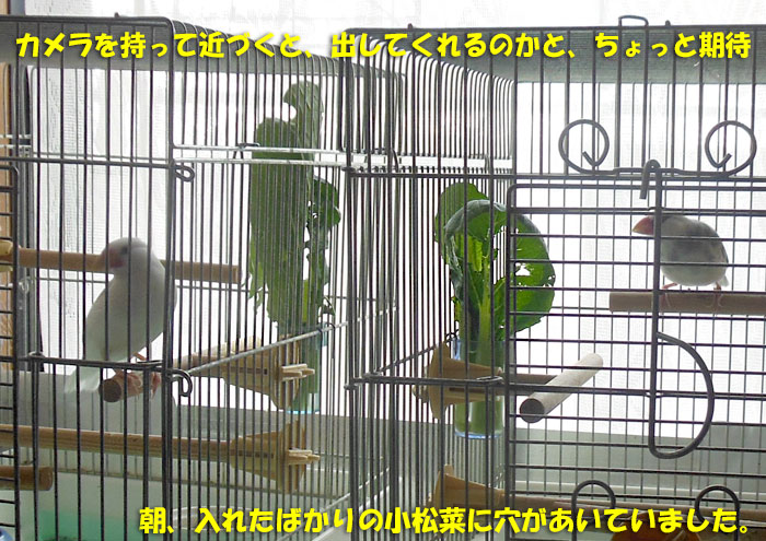 ころちゃんの方の小松菜は、真ん中に大きな穴があいていますね。端っこから食べればいいのに、と思いますが、 ころちゃんは、真ん中に喰いついて、必死で引っ張っていたのでした
