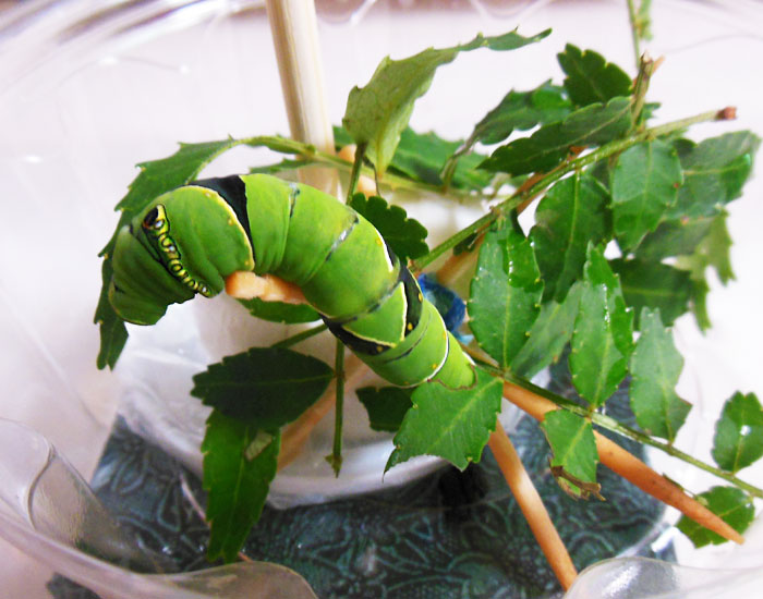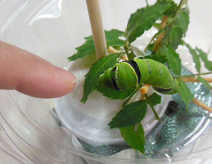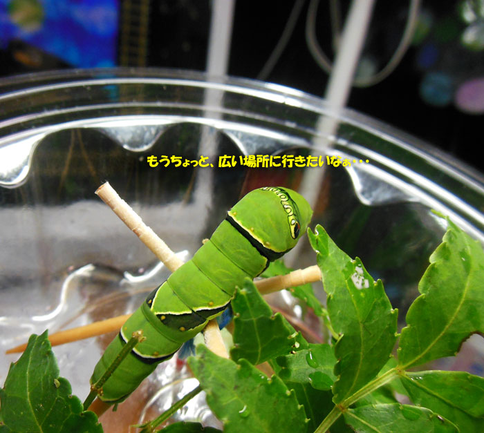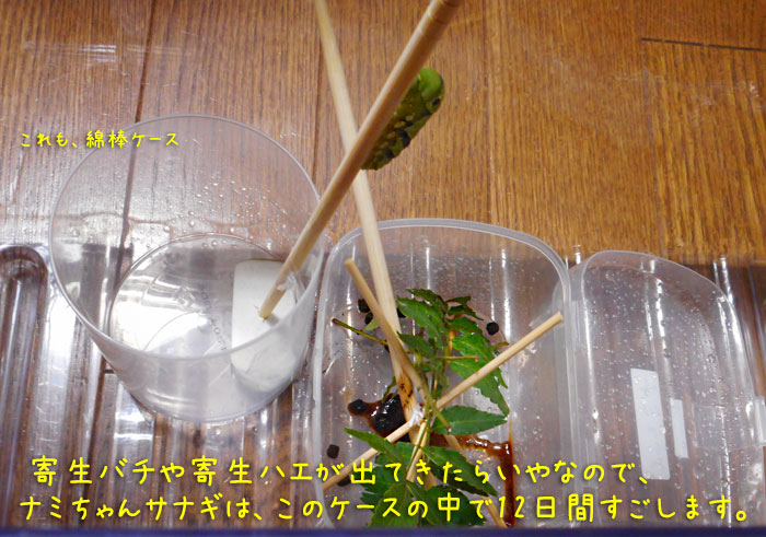 明日くらいには、うろうろし始めて、サナギになる場所を決めると思うので、今日は、サナギ用のケースに入れました。