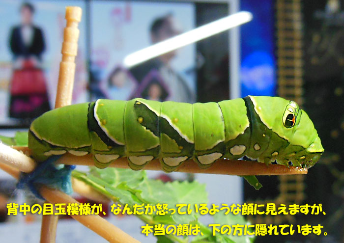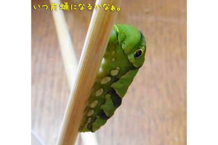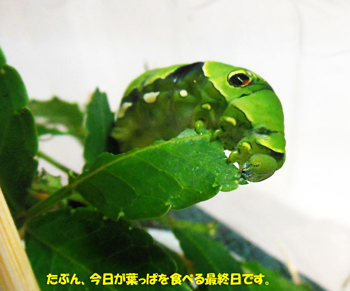 前蛹(ぜんよう)になると、もう葉っぱを食べることはありません。だから、今日が葉っぱを食べる最終日になるのかも。
