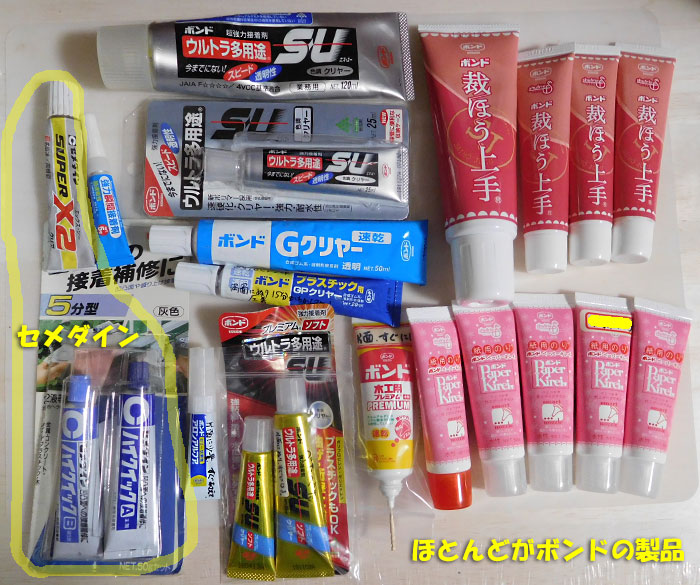 ウルトラ多用途ボンド も、大小二種類ずつ持っています(普通タイプとソフトタイプ)。小さいのは、すぐに使い切ってしまうんですよ。