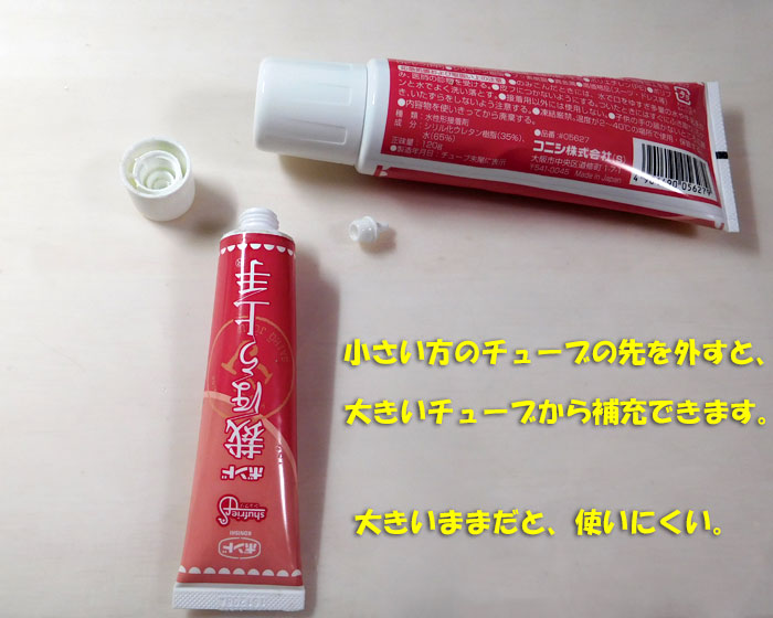 小さい方のチューブの先を外すことができるので、楽に補充できますよ。