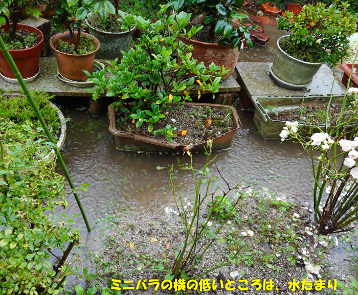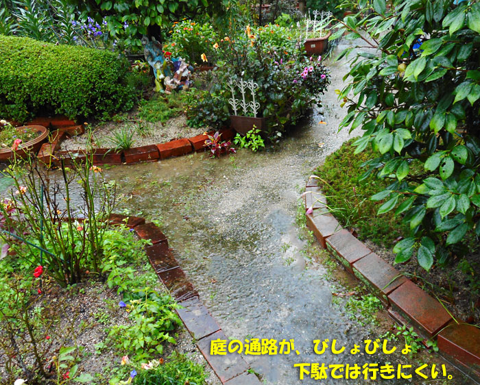 モミジアオイの方に行く通路がビチャビチャで、下駄で歩く気になりません。革靴を濡らすのはいやだし、わざわざ長靴を履いてまで行くのもね・・・