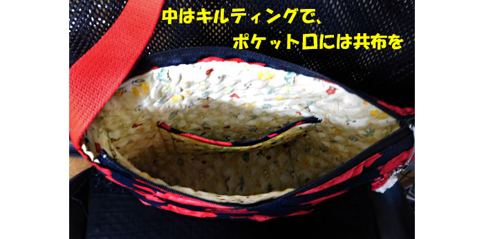 そんなに厚くない、普通の木綿布なので、 中にキルティング を使って、しゃんとさせました。