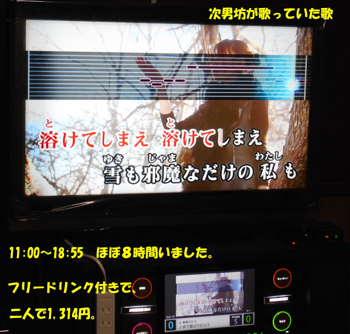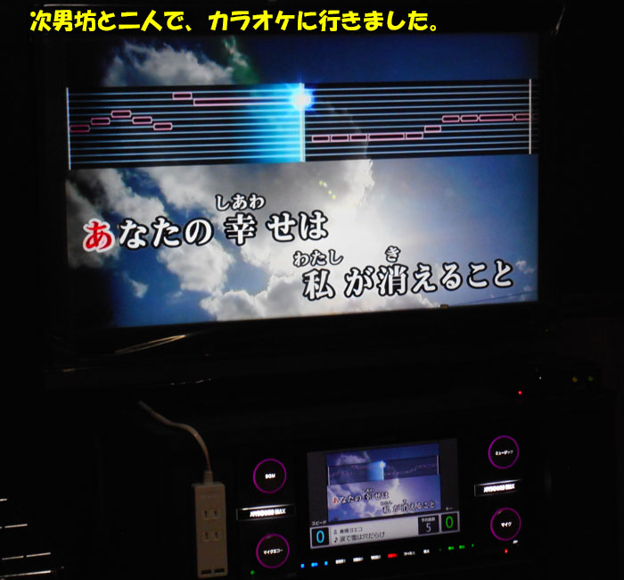 それで、というわけでもないのですが、珍しく平日に休みがとれた 次男坊と、昨日カラオケに 行きました。