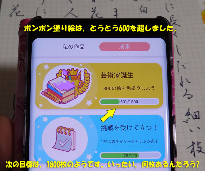最後におまけ。ポンポン塗り絵は、 600を超しました