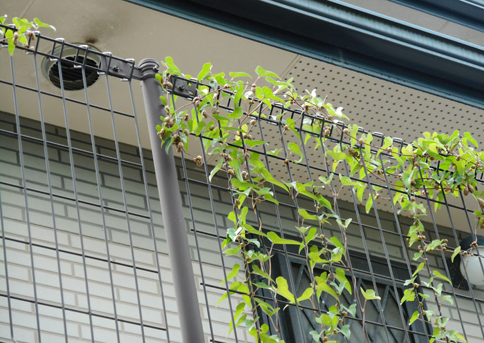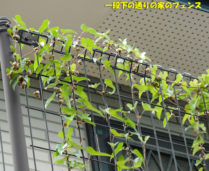 それから、こちらはひとつ下の道路沿いの家。道路よりもだいぶ高いところに家が建っていて、庭は南側、道路は北側。というわけで、このフェンスも家の裏側になります。