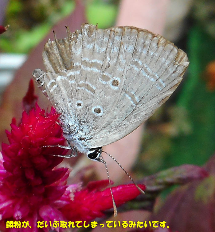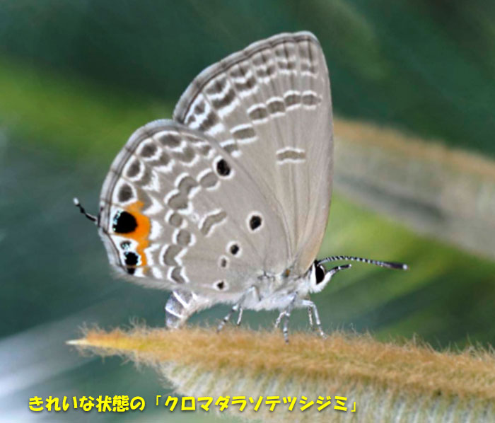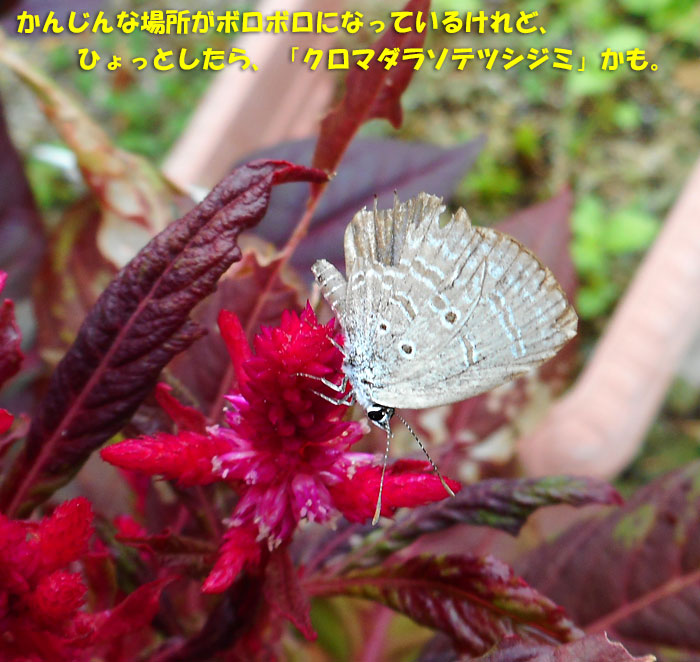 ボロボロだけど、どうもクロマダラソテツシジミのようです。