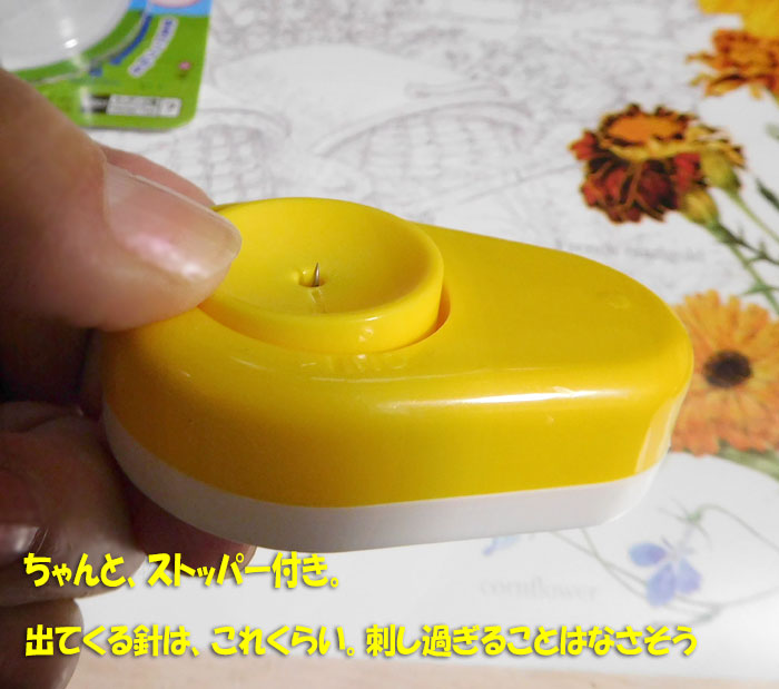 ストッパーを外すには、丸いところを回します。すると、ほんのちょっと針が突き出ます。