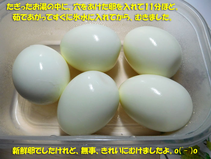 半熟卵は苦手なので、11分茹でて、すぐに氷水に入れました。