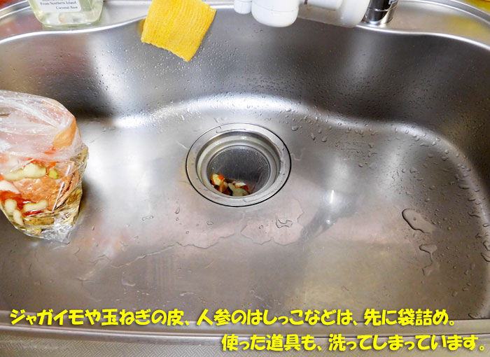煮込んでいる時に、使ったものは洗って片づけてしまいます。野菜くずも、まとめてしまいます。手で拾えなかった小さなクズが、真ん中のネットの中へ。