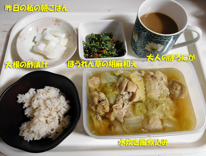 それから、昨日のせそこなっていたけれど、昨日の朝ごはんは、その前の日の水炊き風煮込みでした。