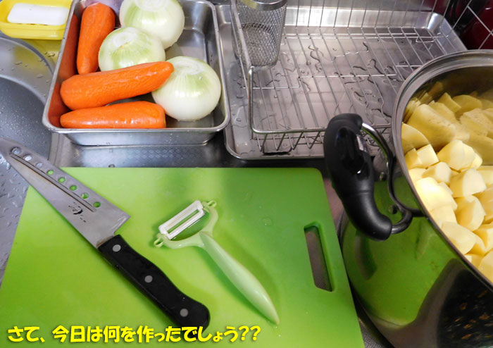 材料を見るとカレーみたいですが、違います。じゃがいも15個、人参3本、玉ねぎ3個とお肉902グラム。