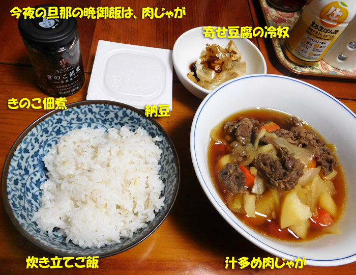 母が、汁が多い方がのどの通りが良いと喜ぶので、汁多めの肉じゃがです。