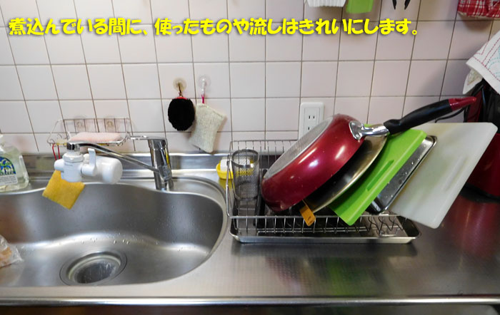 それから、さらによく煮込んでいる間に、流しやそれまで使った物をきれいに洗って片づけてしまいます。