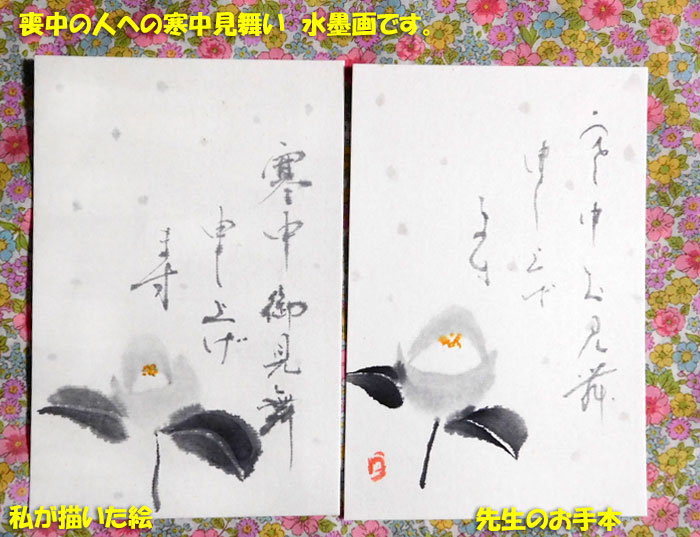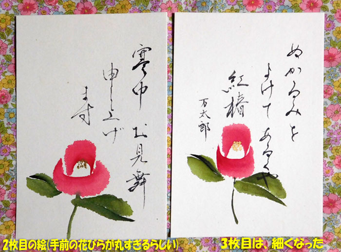 赤い椿は、普通の寒中見舞い用。白い椿は喪中の方への寒中見舞い用です。