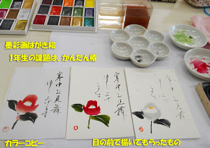 というわけで、美味しくご飯を食べたあと、いつものように早めに墨彩画教室に行きました。