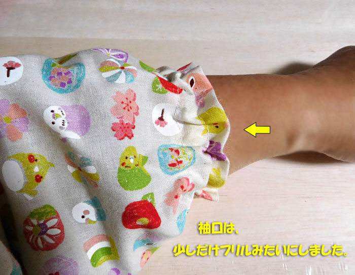 そでぐちは、こんな風にフリルになるようにゴムを入れましたよ。