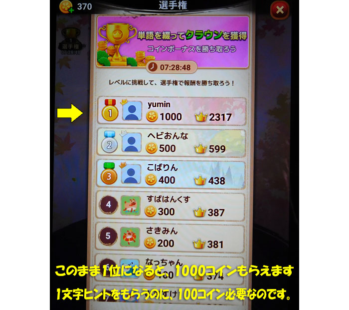 難しい問題では、1文字ヒントをもらうのに、100コイン使うので、1000コインもらったら、10文字分となり、この先心強いですからね。