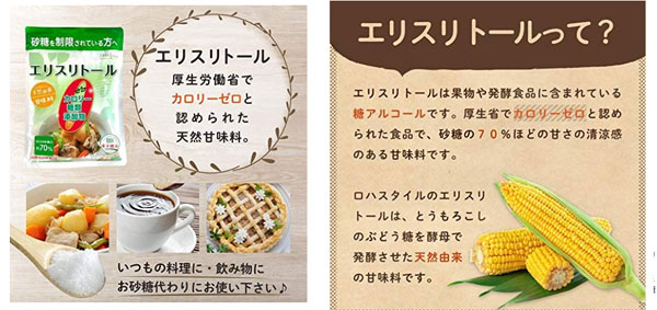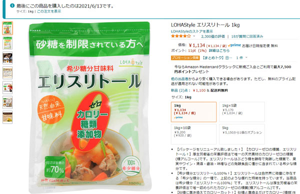 このエリスリトールは、〇マゾンで買ったもの。砂糖の代わりに使うつもりで買いました。